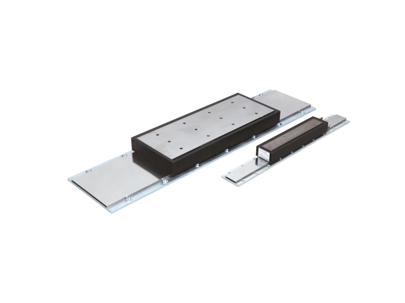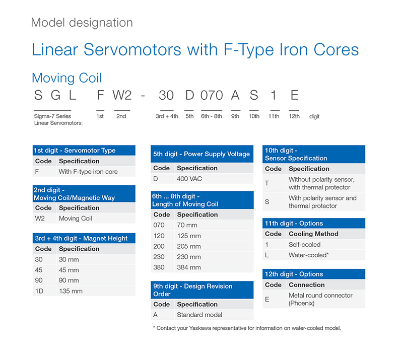 Os servomotores lineares com núcleo de ferro SGLFW2 são compostos por bobinas móveis com núcleo de ferro laminado e pistas magnéticas. Toda a unidade da bobina é protegida por um corpo de resina termicamente condutora para proporcionar rigidez estrutural. A pista magnética é composta por uma fileira de ímanes colocados com precisão num dos lados da placa de suporte de aço niquelado. As tampas magnéticas em aço inoxidável protegem contra pequenos danos acidentais nos ímanes.