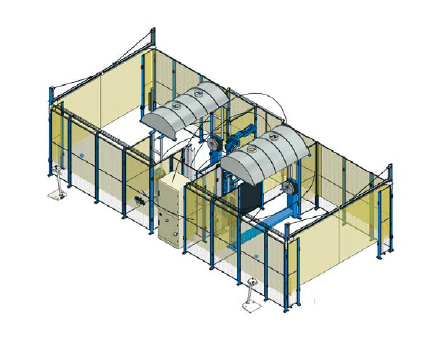 The robot choice is flexible depending on the application and there is a choice of safety system depending on customer requirements and available floor space. This may comprise a light guard system or an automatic roller shutter door in case of optimum floor space utilisation.