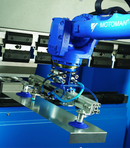 MOTOMAN standard press-brake systems include; orientation table, regrip station, media supply and manual tool changer. The safety fencing can be modified to suit the size of the workpiece.